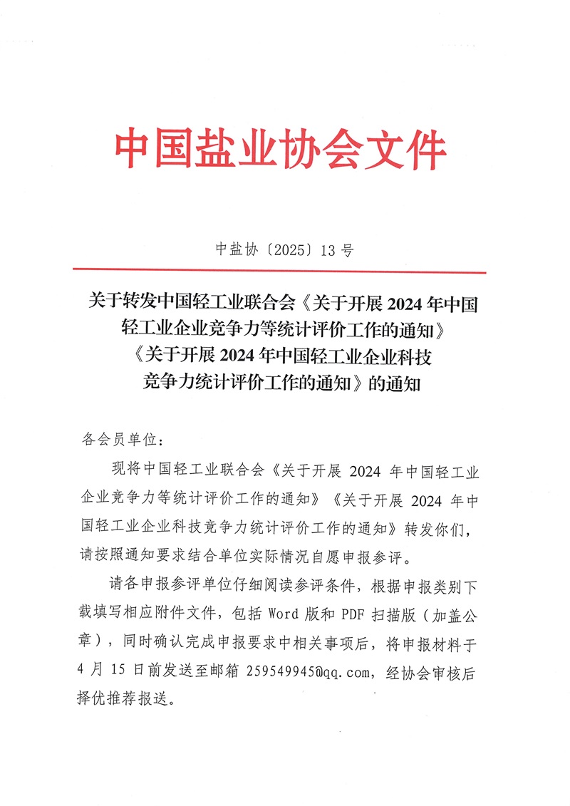 关于转发中国轻工业联合会《关于开展2024年中国轻工业企业竞争力等统计评价工作的通知》《关于开展2024年中国轻工业企业科技竞争力统计评价工作的通知》的通知