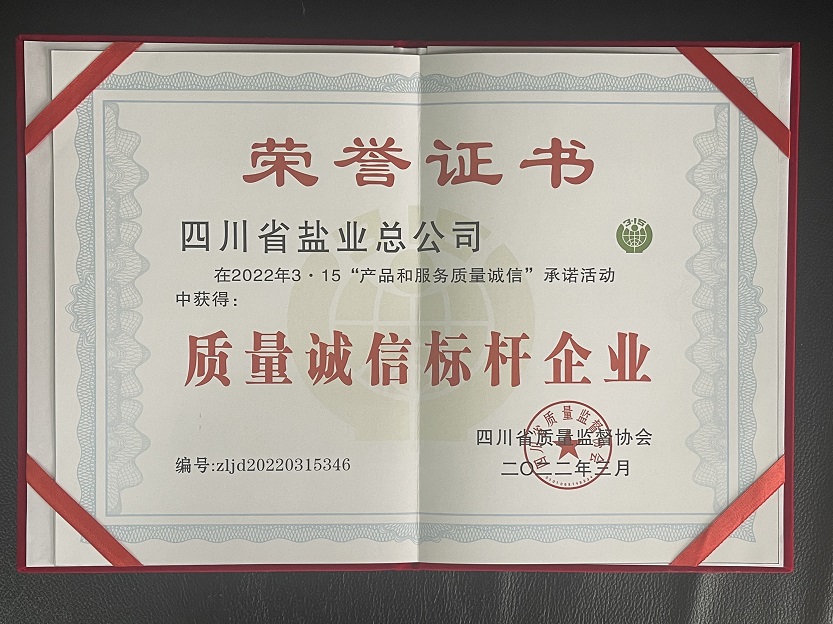 近日,四川省盐业总公司在四川省质量监督协会举办的2022年3.15“产品和服务质量诚信”承诺展示活动中被授予“质量诚信标杆企业”称号。