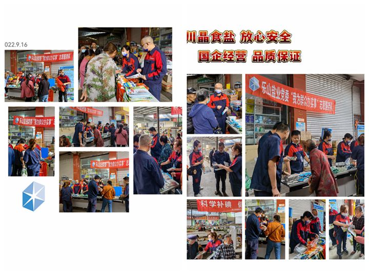 地推宣传当日一早,志愿队成员便开始忙碌的筹备工作。天微微亮,从运输盐品到人员安排;从摆展架、拉横幅到发放宣传资料,各项工作部署周到全面、有条不紊。早晨,正值居民买菜的高峰期,农贸市场内人流涌动。结合全民健康生活方式行动国家行动办公室发起的“9·15”(每日就要5克)健康用盐理念,党员、干部积极为过往群众宣传健康用盐知识,我们以红精纯盐、低钠盐、深井晶盐、深井钙盐、零添加抗结剂几款盐品为主,介绍其主要成分、适用人群,并广泛普及“食盐加碘防治碘缺乏病”知识。大力将“川晶食盐 放心安全 国企经营 品质保证”的国企承诺广而告之!
