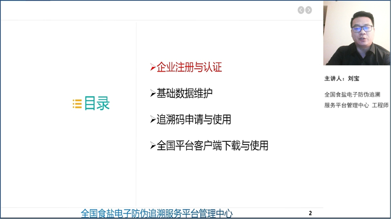 刘艳杰讲解了食盐电子追溯工作建设情况及具体要求,对食盐追溯载体进行了详细说明,介绍了全国食盐电子防伪追溯服务平台(简称全国平台)的主要功能和各企业追溯系统“有效运行”的符合性审查方案,并就近期企业提出的问题进行了答疑解惑。