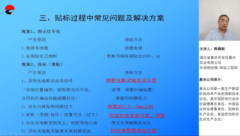 陈耀新介绍了食盐标码标志和追溯码印制使用过程中容易出现的问题及解决办法。他主要讲解了贴标机的结构、工作原理和特点,被贴包装物设计的注意事项,贴标过程中的常见问题及解决方案,贴标机的日常维护,标码合一标志是食盐包装实现追溯的有效手段等内容。