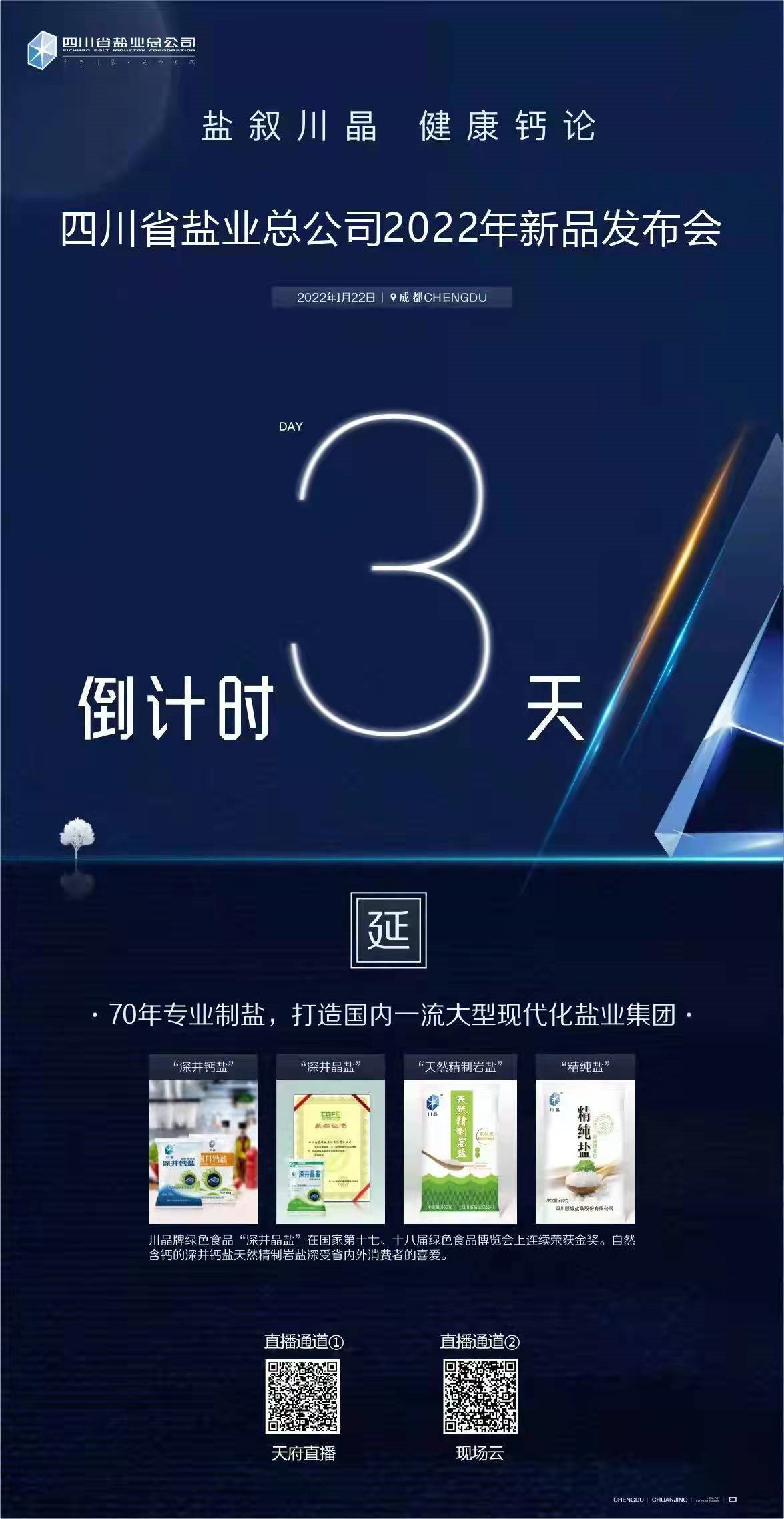 四川省盐业总公司将于2022年1月22日(周六)下午14:30召开“盐叙川晶 健康钙论”畅销品暨新品线上发布会,地址1:天府直播直播 https://live.tianfulive.com/live/tvchat-129563390?shauid=xBKyB1L2N8AsaHe9Yd2-Gw**&vprid=0&sharetstamp=1641981728153&ver=153fa377c06948e0ba10b11bdb005129&auth_time=1642557125,直播地址2:四川经济日报新华社现场云(https://xcyh5.xinhuaxmt.com/newh5/#/report-list?liveId=1642519349263994);或者扫描以下二维码参加线上直播互动。总公司官方抖音、快手视频号(抖音、快手搜索并关注“四川省盐业总公司”)将同步直播。直播平台下午14:00开播,欢迎各位朋友光临!