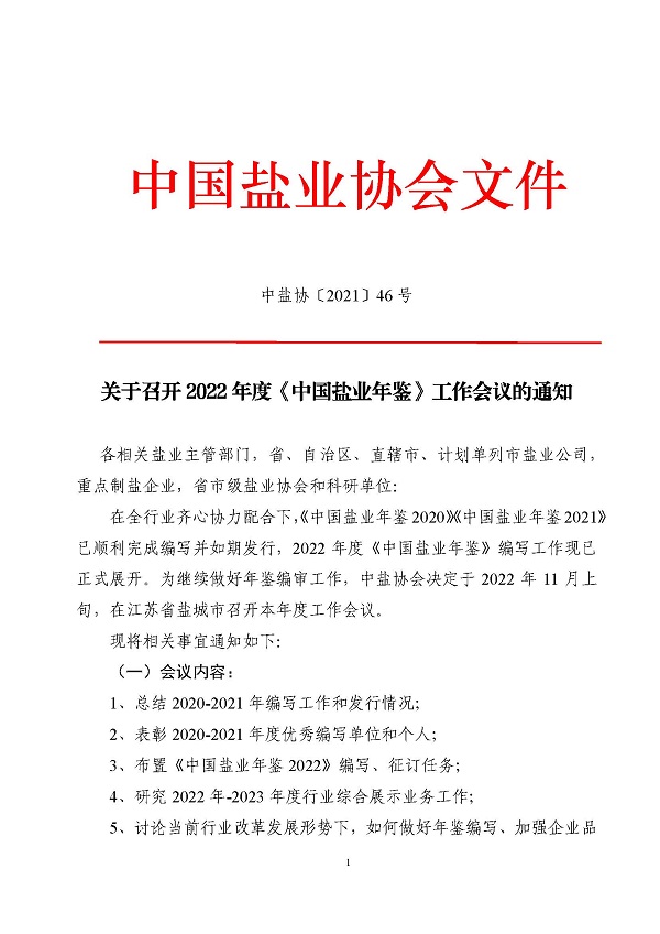 关于召开2022年度《中国盐业年鉴》工作会议的通知
