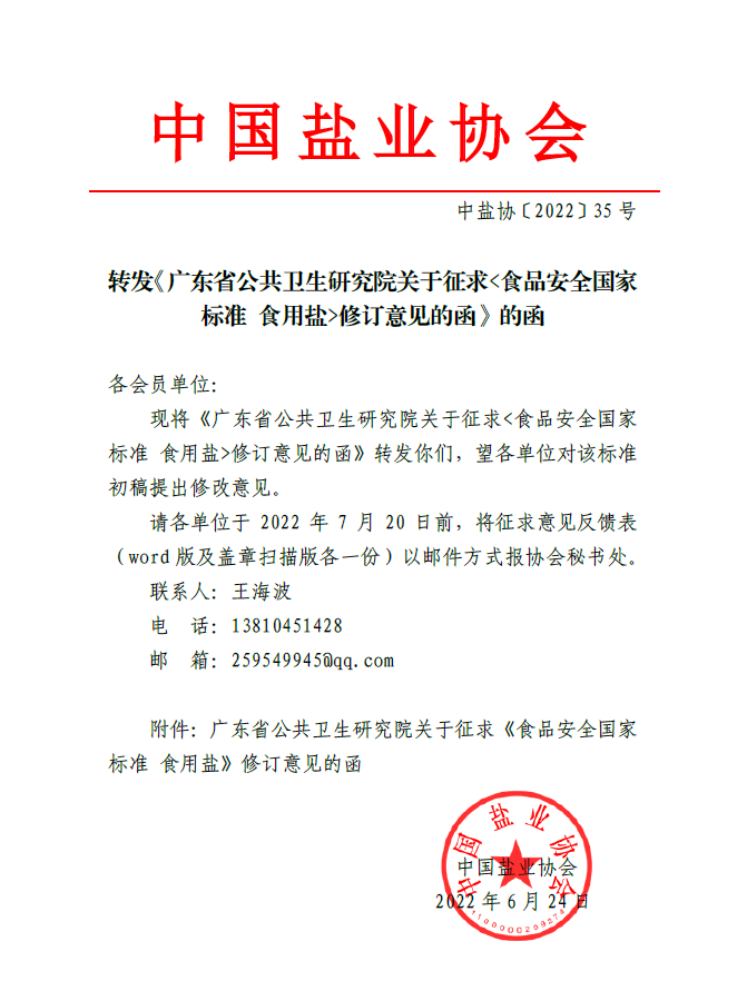 转发《广东省公共卫生研究院关于征求<食品安全国家标准 食用盐>修订意见的函》的函