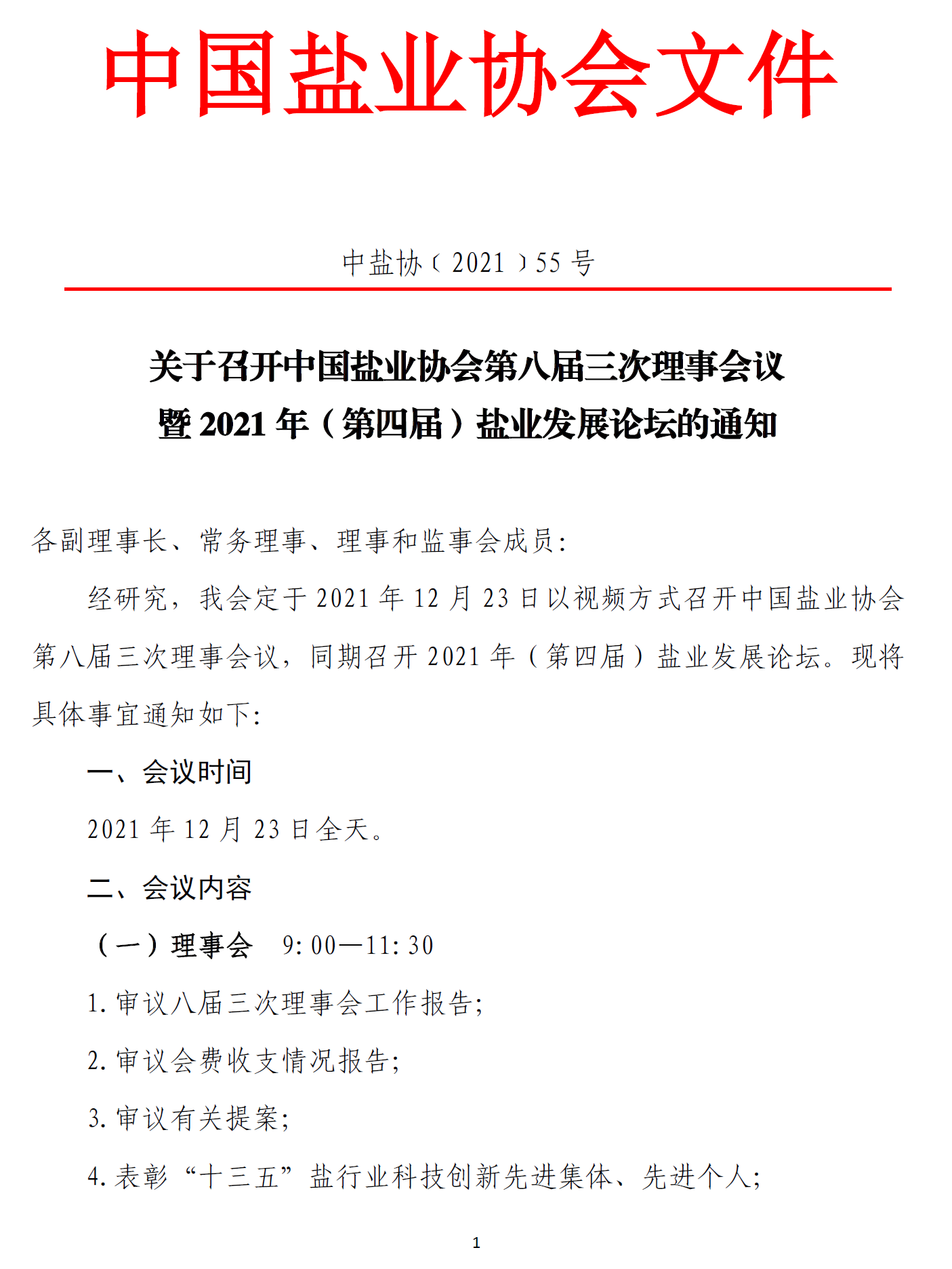 关于召开米兰网页版第八届三次理事会议暨2021年(第四届)盐业发展论坛的通知