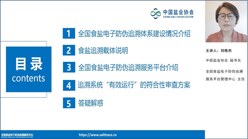 刘艳杰讲解了食盐电子追溯工作建设情况及具体要求,对食盐追溯载体进行了详细说明,介绍了全国食盐电子防伪追溯服务平台(简称全国平台)的主要功能和各企业追溯系统“有效运行”的符合性审查方案,并就近期企业提出的问题进行了答疑解惑。